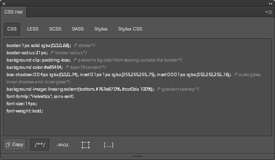 Quem possui Adobe Photoshop CS4, CS5 ou CS6 e trabalha com desenvolvimento web, vai adorar a extensão CSS Hat, que aumenta muito a produtividade. O CSS Hat é uma extensão para Photoshop que adiciona uma janela com ferramentas que gera código CSS e CSS3 automaticamente a partir dos efeitos nas layers. Gradiente, opacidade, sombra, fonte, cor, alinhamento etc, tudo é gerado em código sem que precisemos identifica-los manualmente.